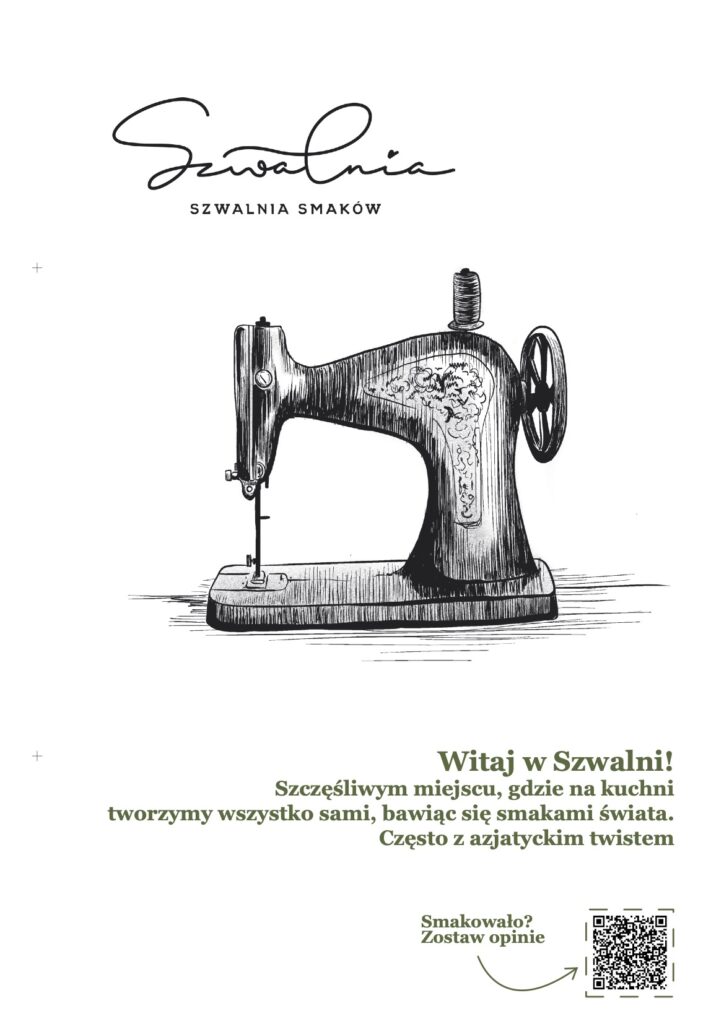 Jeste艣my dla Was:Wt: 16:00 – 21:00艢r – Czw: 12:00 – 21:00Pt – Sob: 12:00 – 22:00Nd: 12:00 – 18:00 Zobacz nasz膮 ofert臋 na przyj臋cia Jeste艣my na Zjedz.my, zarezerwuj u nas stolik: Zarezerwuj stolik Dowozimy zam贸wienia przez: Przeczytasz i obejrzysz o nas: Nasze menu: Szwalnia – Kuchnia i desery Piotrkowska 217 90-451 艁贸d藕 szwalniasmakow@gmail.com +48 603 036 113 Facebook Instagram